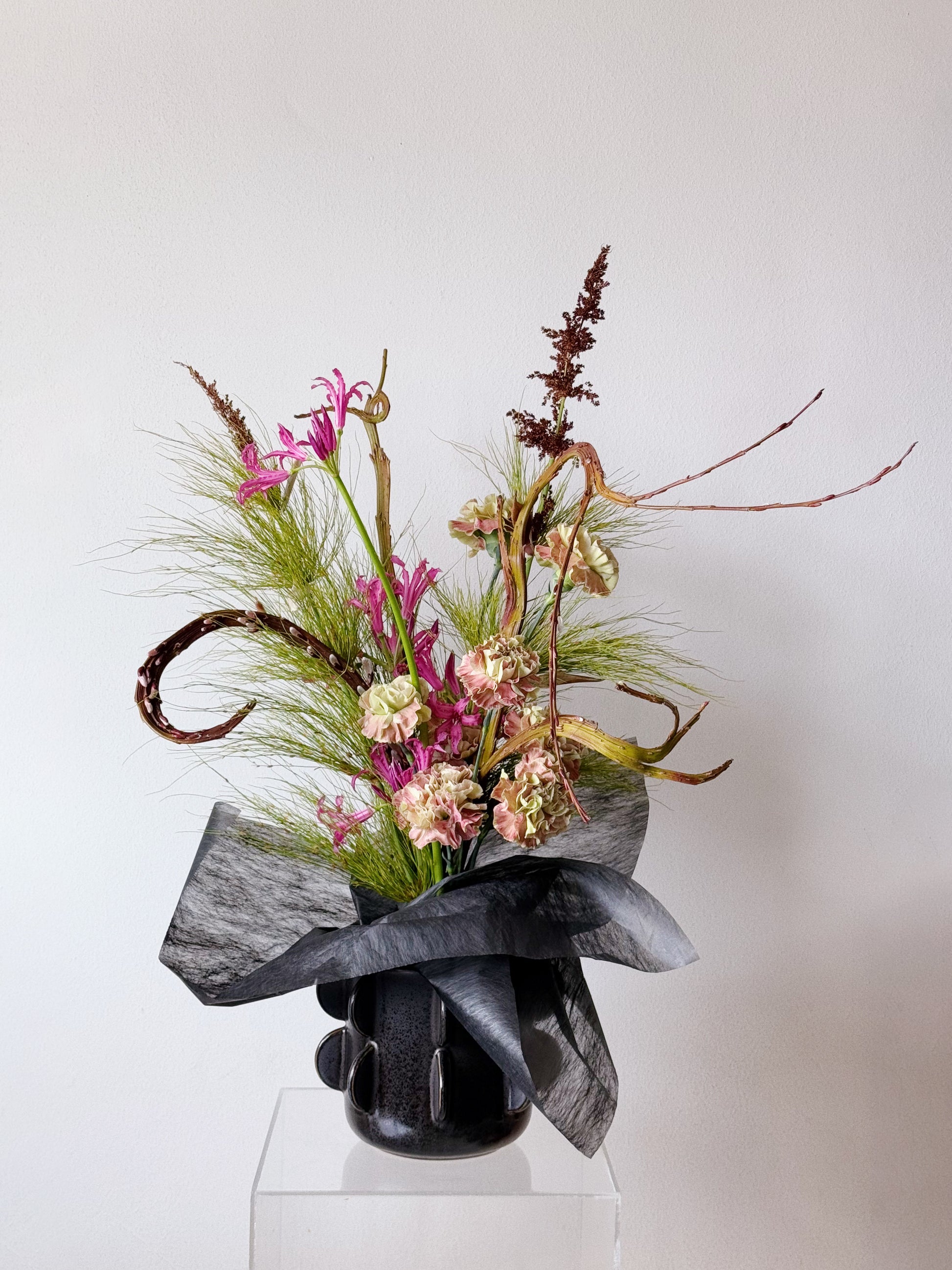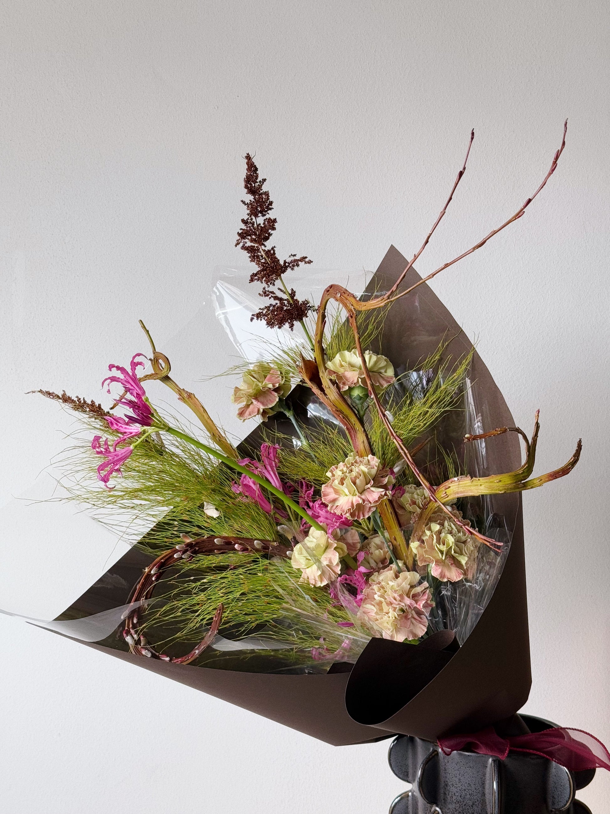 Kelp Forest is a combination of bi-coloured Carnations, Nerine, Salix and Cape Feathers.