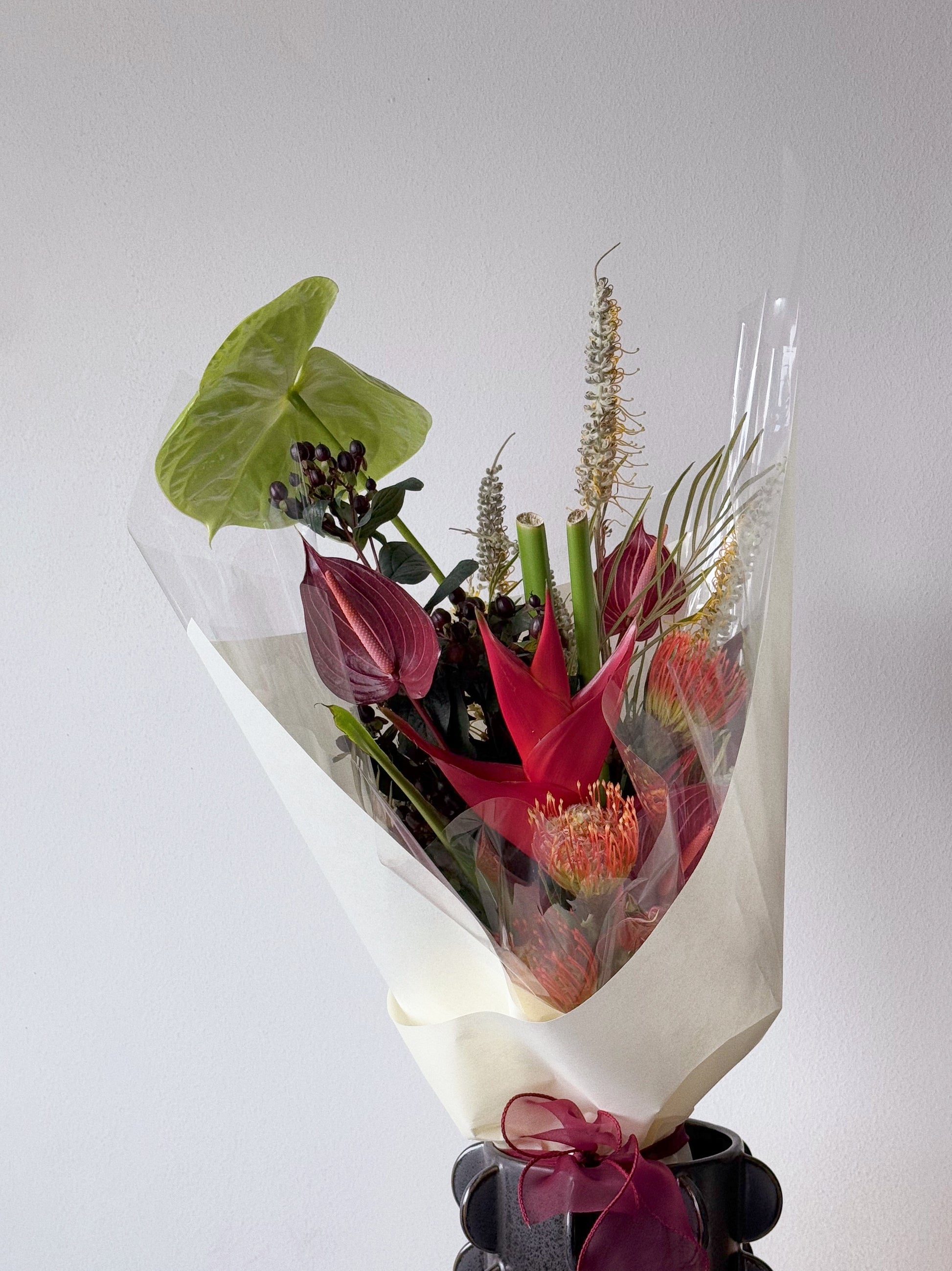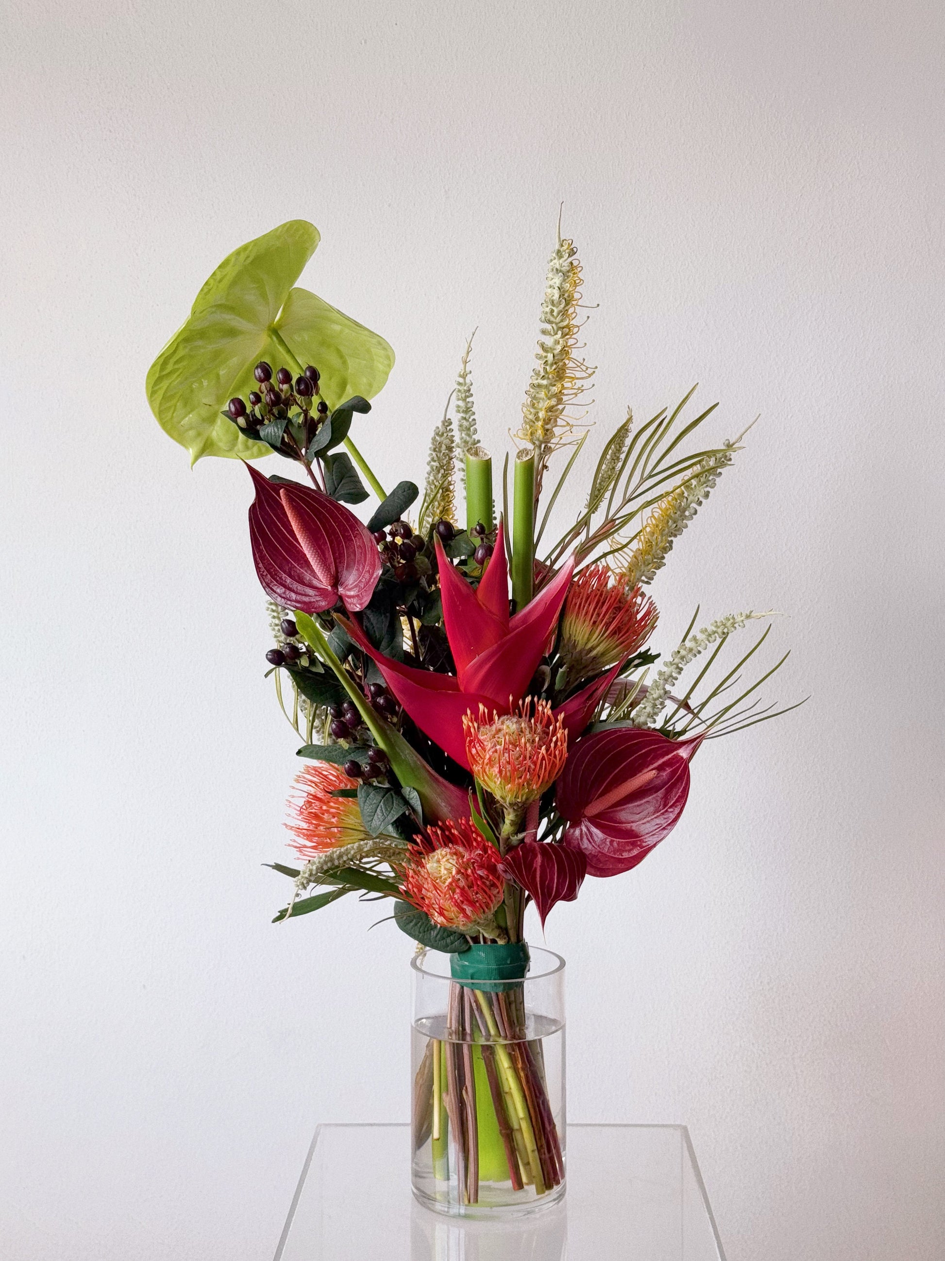 Reef is a combination of Anthuriums, Pincushions, Hypericum, Grevillea and Heliconia.